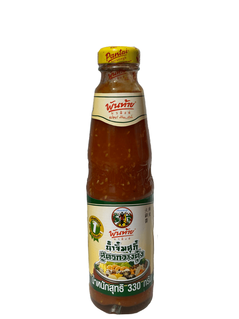 น้ำจิ้มยี่ห้อพันท้ายนรสิงห์น้ำจิ้มสุกี้สูตรกวางตุ้ง ผลิตจากกระเทียม พริกกะเหรี่ยง และงาขาวคุณภาพดี